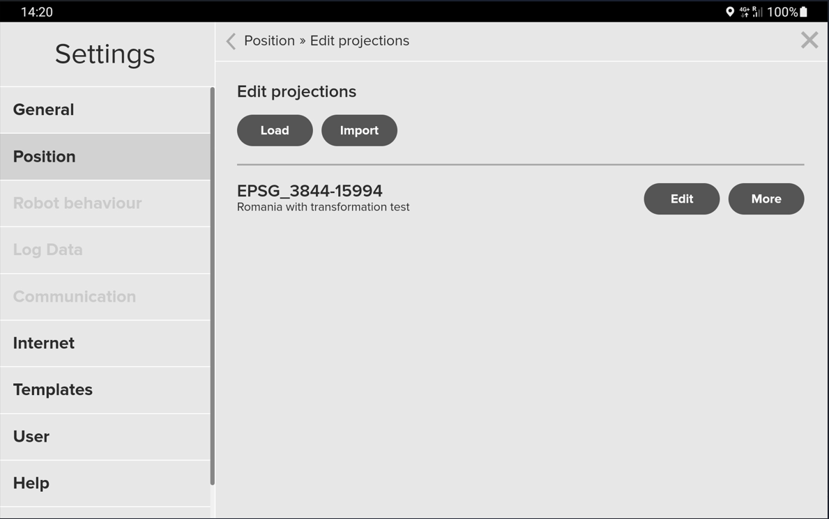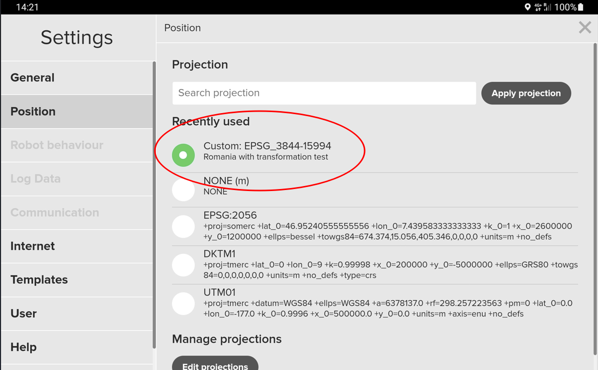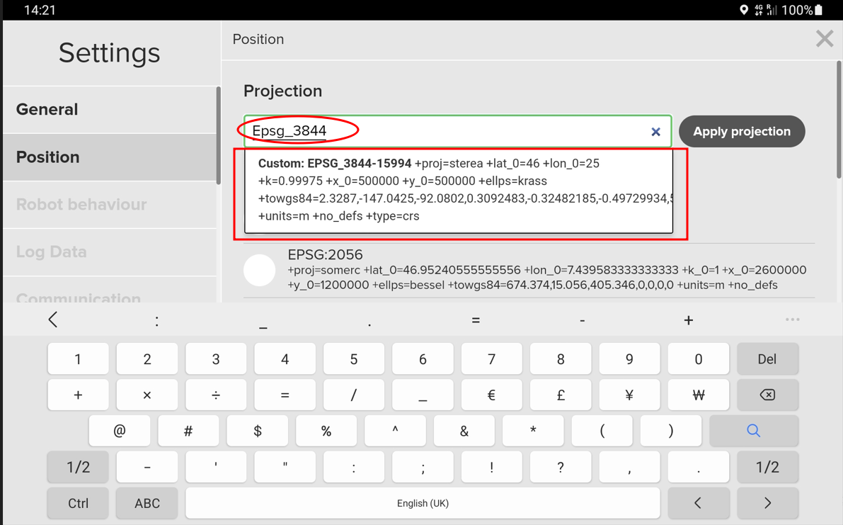 The TinyMobileRobots Surveyor App supports importing of projection files. This gives you an option to import your own projection, when you can't find the projection you're looking for via search bar on the in-App library ( See Importing Job Files: How do I Select the Right Projection?...)